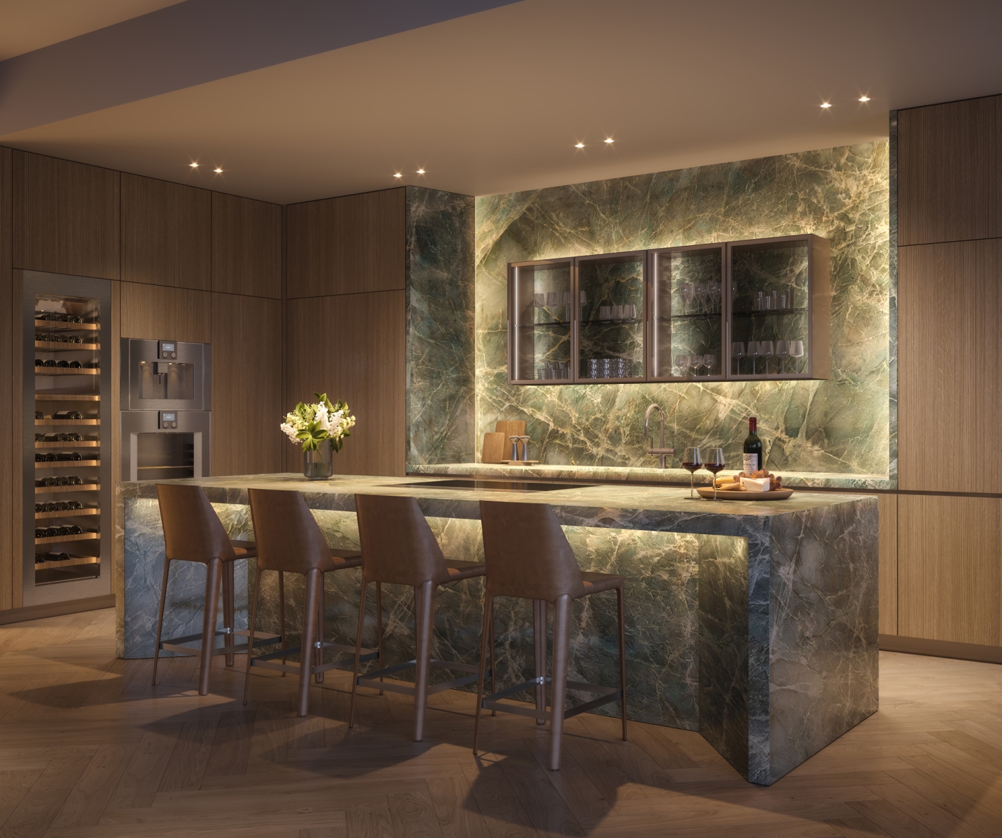 - Wood flooring selection includes choice of: - Listone Giordano Mont Blanc Plank - Listone Giordano Pagani Chevron (custom-designed) - Ginger Glocal Mirage Ceramic Tile